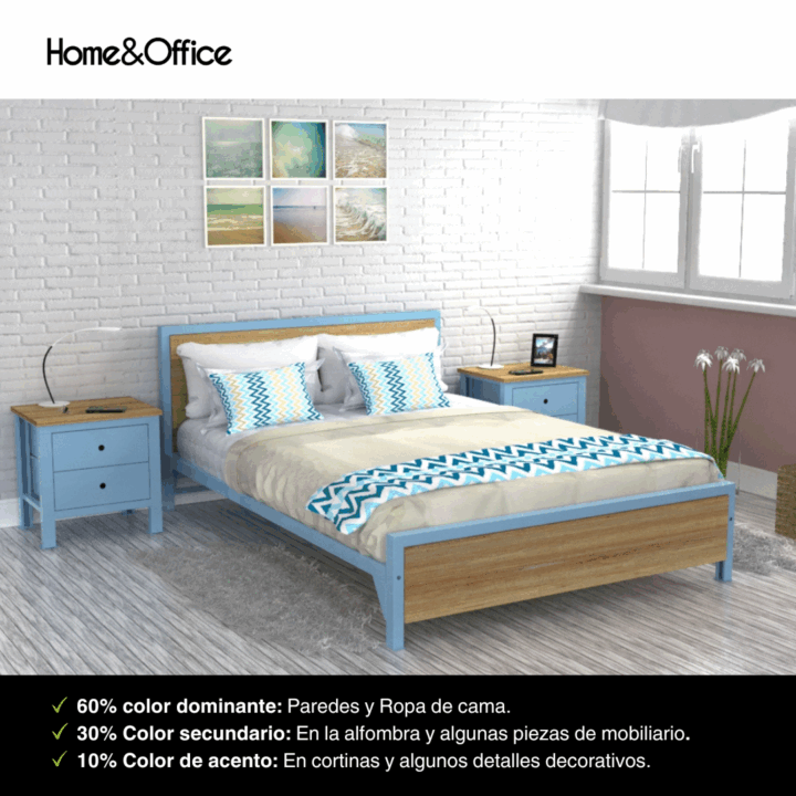 - 60% Color Dominante (el más amplio): Este es el color principal de la habitación. Piensa en las paredes o los muebles de mayor tamaño como una cama grande. Es el telón de fondo que establece el tono general y la sensación del espacio. Suelen ser colores neutros o suaves para no saturar.